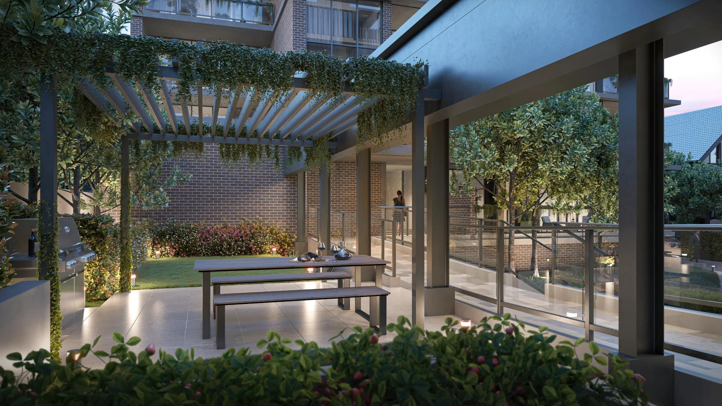 • Ground-floor courtyard with boardwalk.