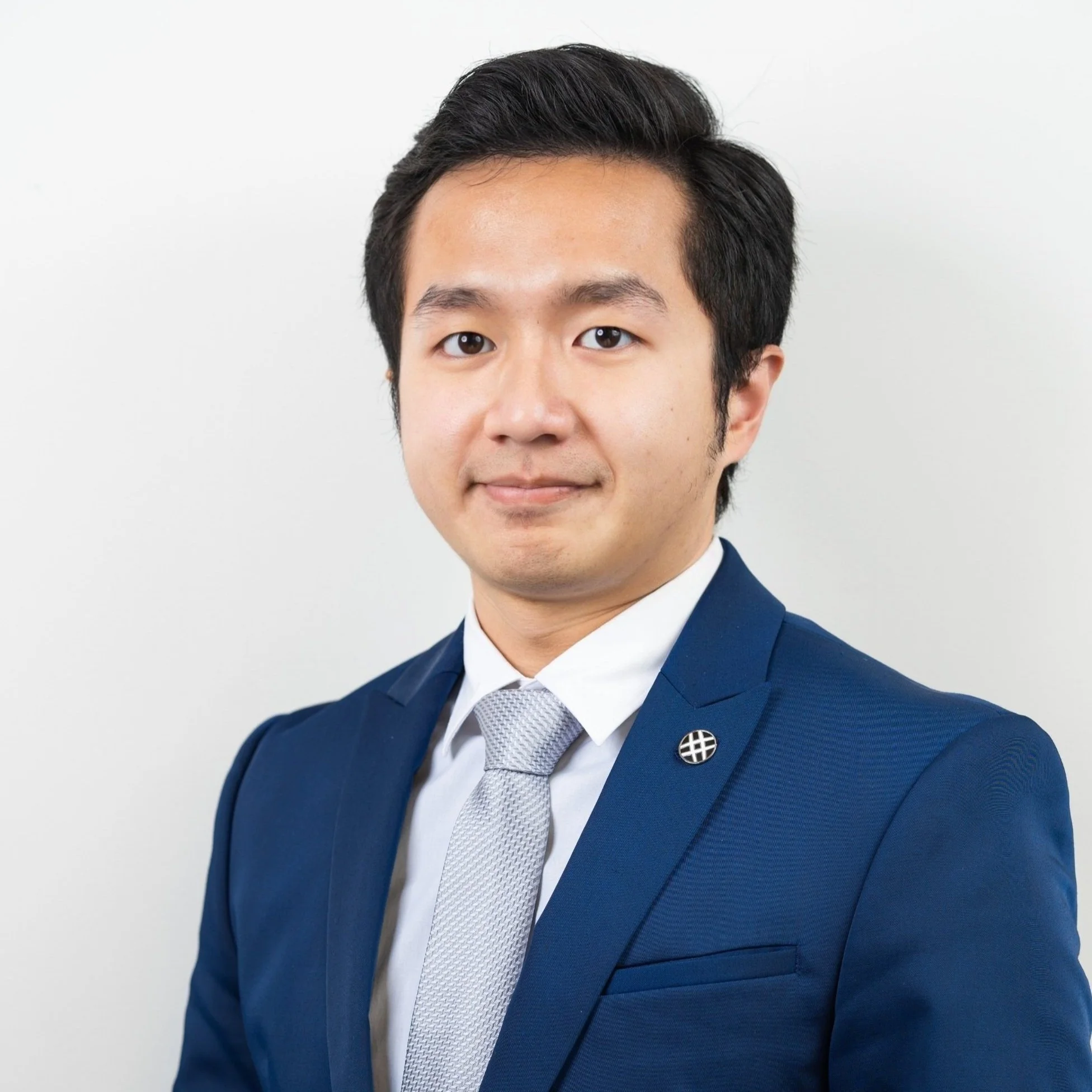 Headshot of a young man wearing a navy blue suit, white shirt, and light gray tie, standing against a plain white background.